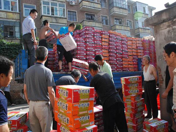 8月15日一大早,長(cháng)開(kāi)廠(chǎng)公司和二一三公司領(lǐng)導又親臨裝運現場(chǎng),指揮物資裝運,上午11時(shí)許,救災物資裝車(chē)完畢,由長(cháng)開(kāi)廠(chǎng)公司支援的1551箱方便面、60件火腿腸、5件榨菜和長(cháng)城電工二一三公司支援的2210箱礦泉水,總價(jià)值74138元的救災物資由天水長(cháng)開(kāi)公司黨委書(shū)記白天洪和二一三公司黨委書(shū)記楊大友帶隊火速送往白銀公司廠(chǎng)壩鉛鋅礦。
